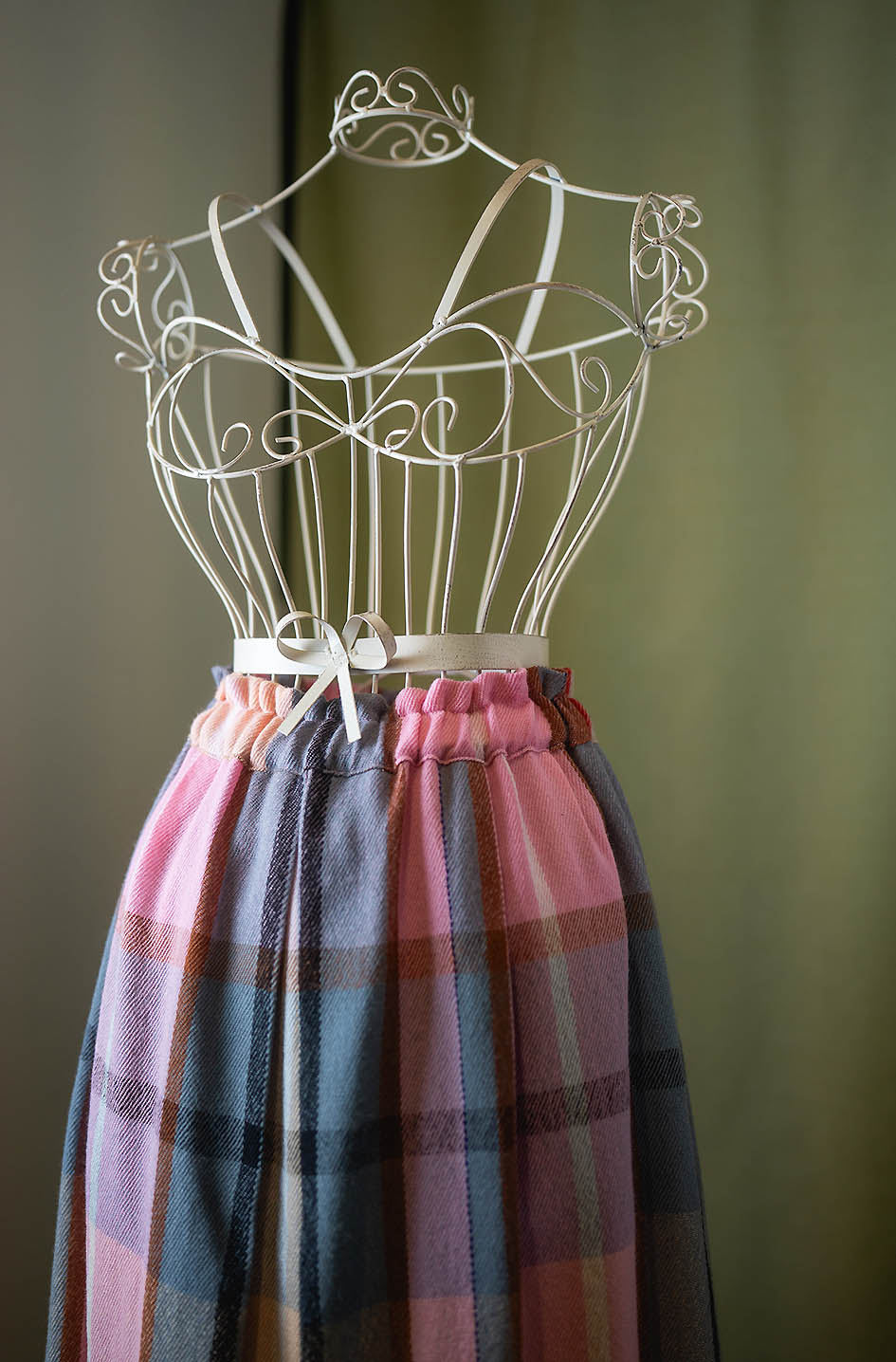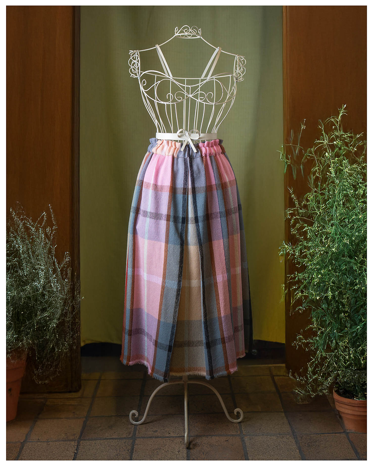 GONNA IN TESSUTO DI PURA LANA BIELLESE, FANTASIA SCOZZESE NEI TONI DEL ROSA/GRIGIO/AZZURRO/GIALLO, ELASTICO IN VITA, TG. M , LARGH. MAX GIROVITA CM. 106, LUNGH. CM. 78, ORLO SFRANGIATO. INTERAMENTE ESEGUITA A MANO.