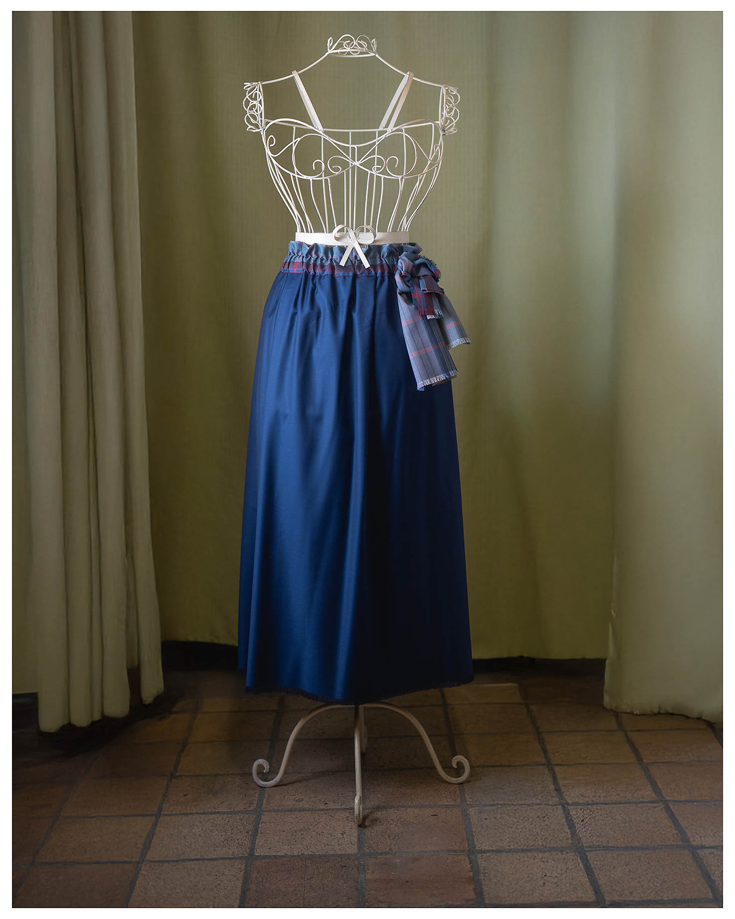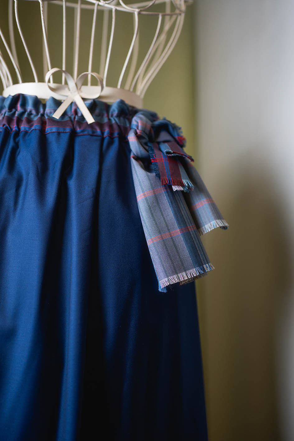 GONNA IN TESSUTO DI FRESCO LANA BIELLESE, COLORE BLU, FASCIA CON ELASTICO IN VITA IN FANTASIA SCOZZESE APPLICAZIONE FIOCCO REMOVIBILE, TG.S/M, LARGH. MAX GIROVITA CM. 100, LUNGH. CM. 82, ORLO SFRANGIATO. INTERAMENTE ESEGUITA A MANO.