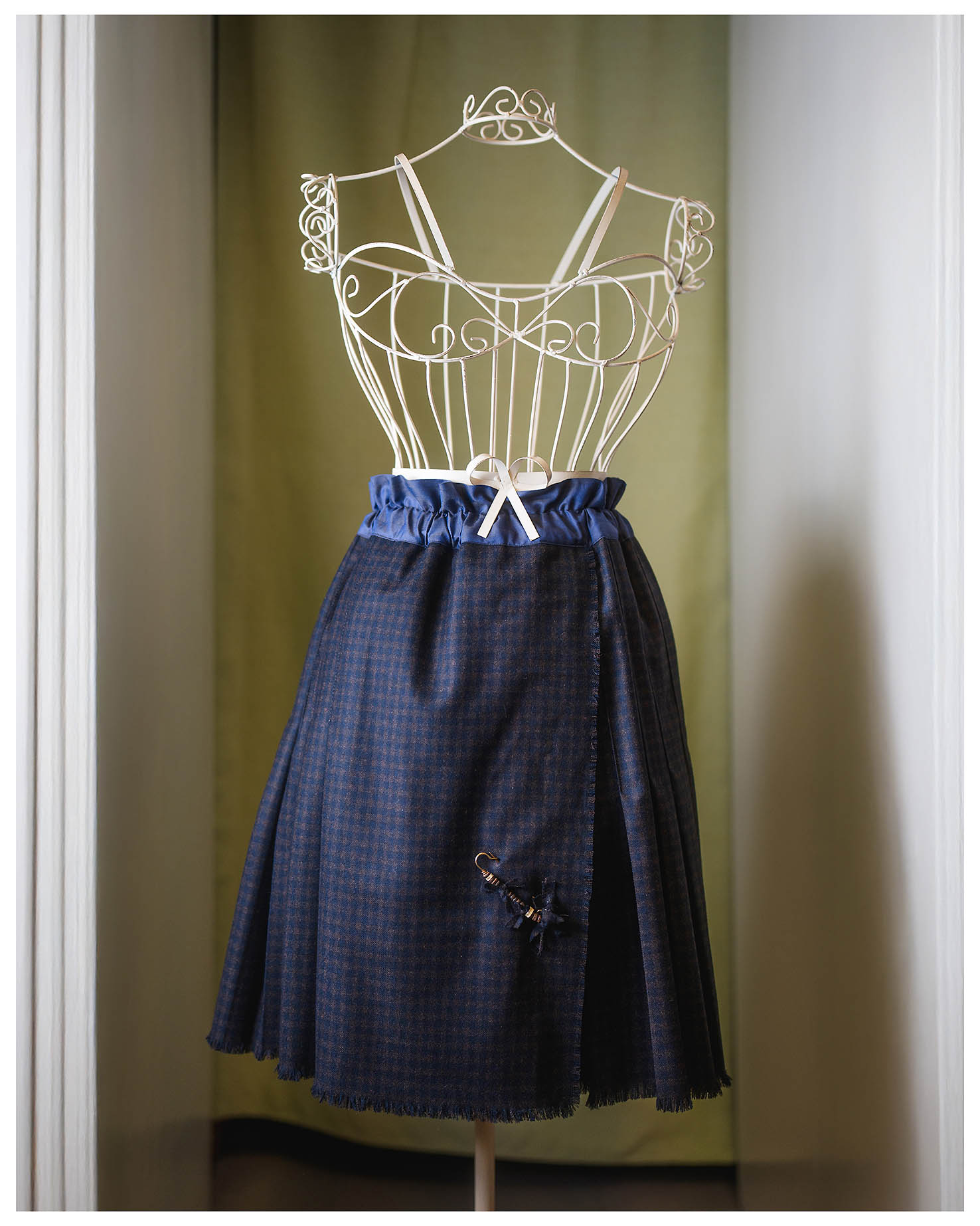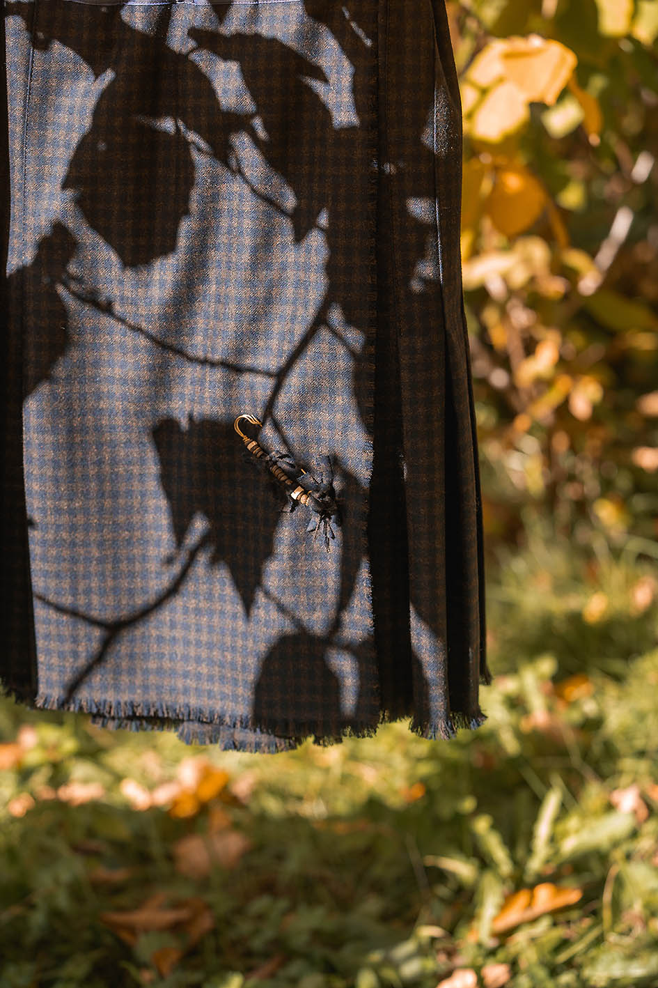 GONNA KILT IN TESSUTO DI PURA LANA BIELLESE, COLORE A QUADRETTI MARRONE SCURO/BLU, FASCIA CON ELASTICO IN VITA IN COLORE BLU, TG.S/M, LARGH. MAX GIROVITA CM. 100/102, LUNGH. CM. 56, ORLO SFRANGIATO, SPILLONE FANTASIA. INTERAMENTE ESEGUITA A MANO.