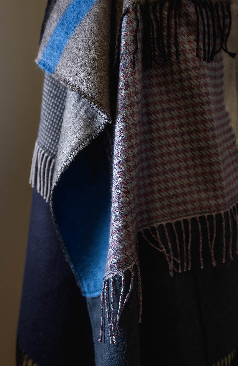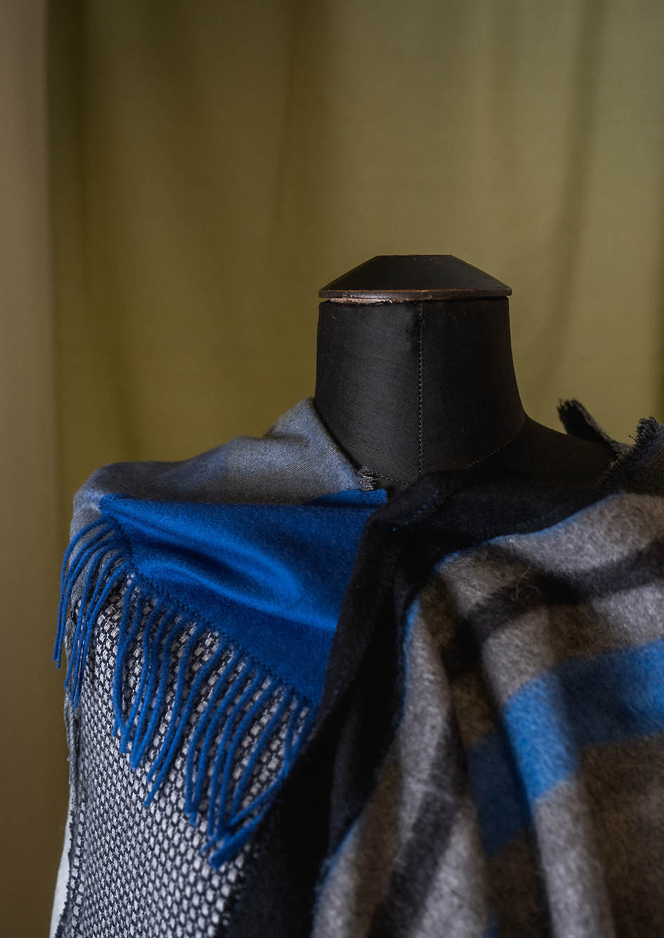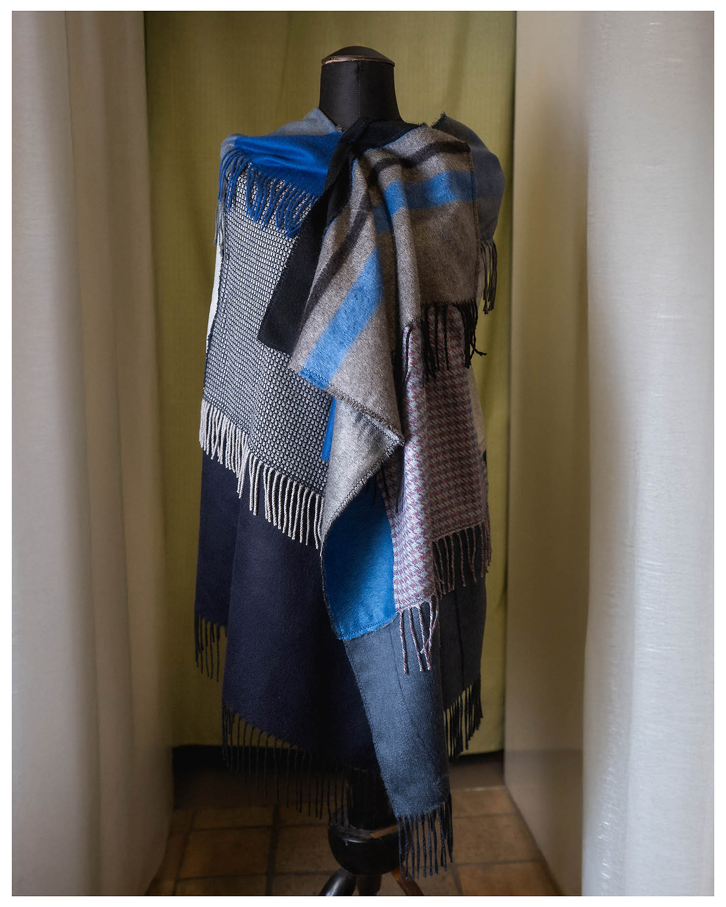 MANTELLA IN MORBIDO TESSUTO PURO CASHMERE DEL TERRITORIO BIELLESE, LAVORAZIONE PATCHWORK, COLORE NEI TONI DEL BLU/GRIGIO, MISURA LARGH. CM. 160, LUNGH. CM. 90, INTERAMENTE ESEGUITA A MANO.